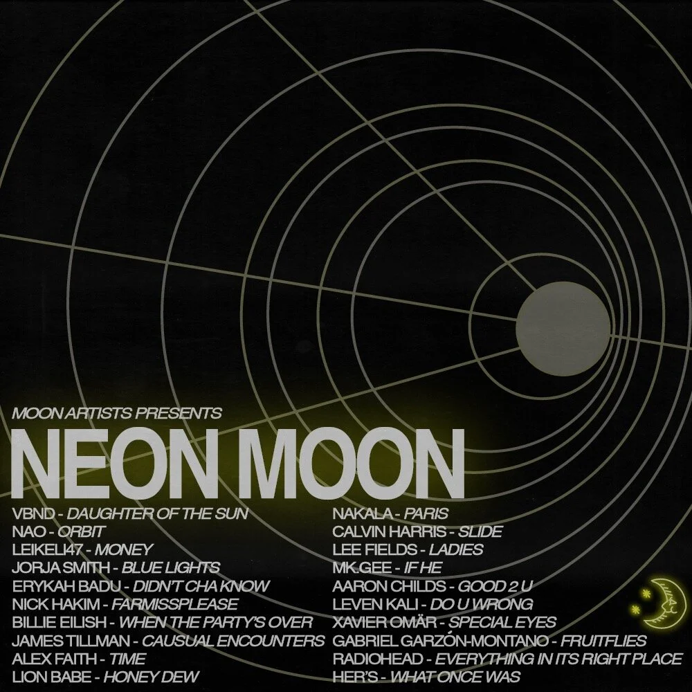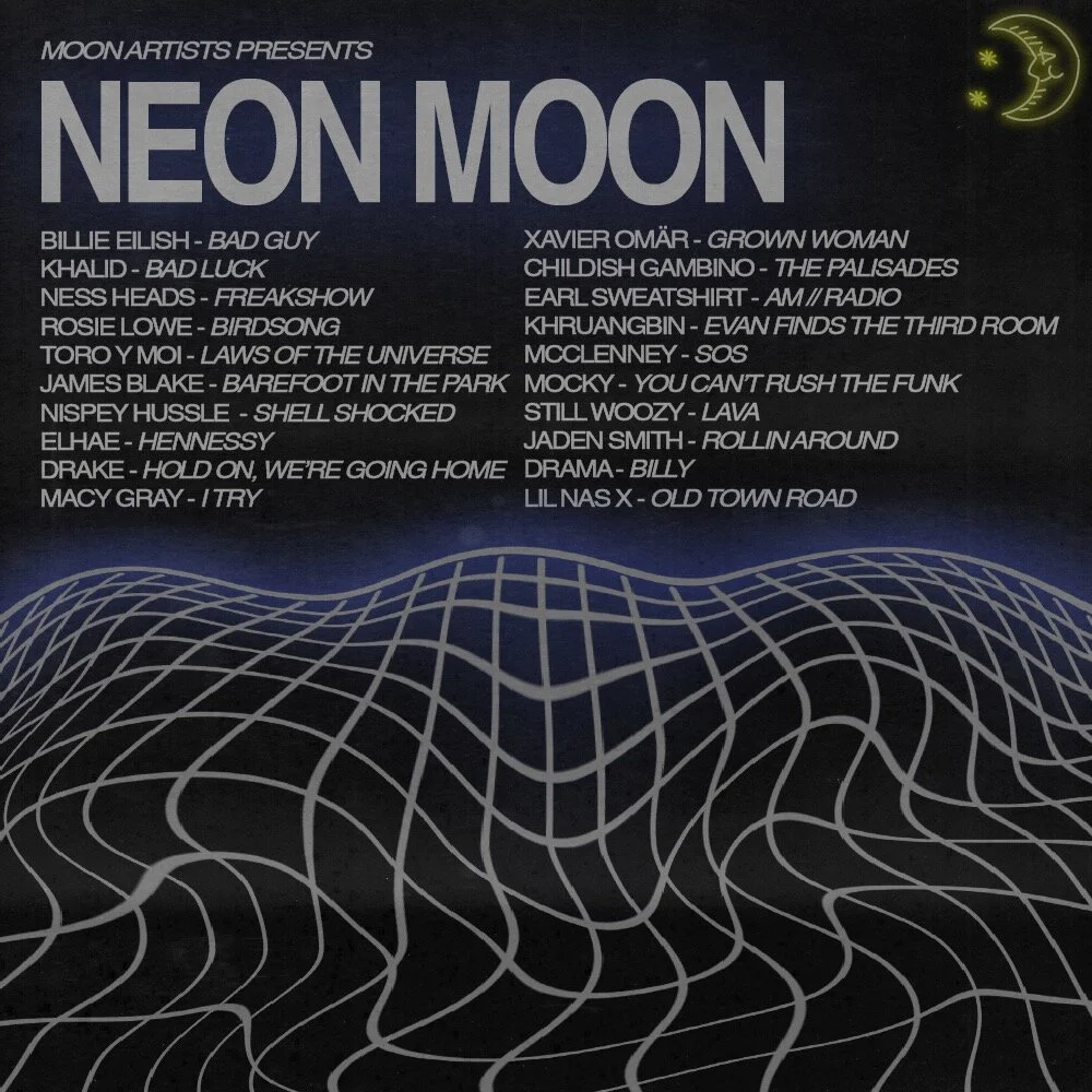 In addition to web design, MOON was running a spotify playlist campaign called “Neon Moon”. I created weekly cover images and content for the rotating playlists. Following the Moon aesthetic, I made visuals to represent a sci-fi outer space theme with neon colors.